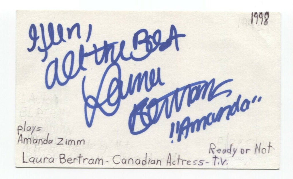 Up for sale is an autographed index card, boldly signed by actress Laura Bertram. This autograph was part of an enormous collection of over 9000 in person collected signatures.