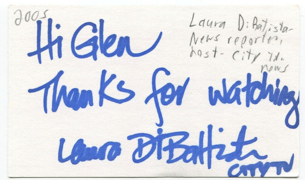 Up for sale is an autographed 3x5 index card, boldly signed by journalist and author Laura Di Battista. Autograph was part of an enormous collection of over 9000 in person collected signatures.