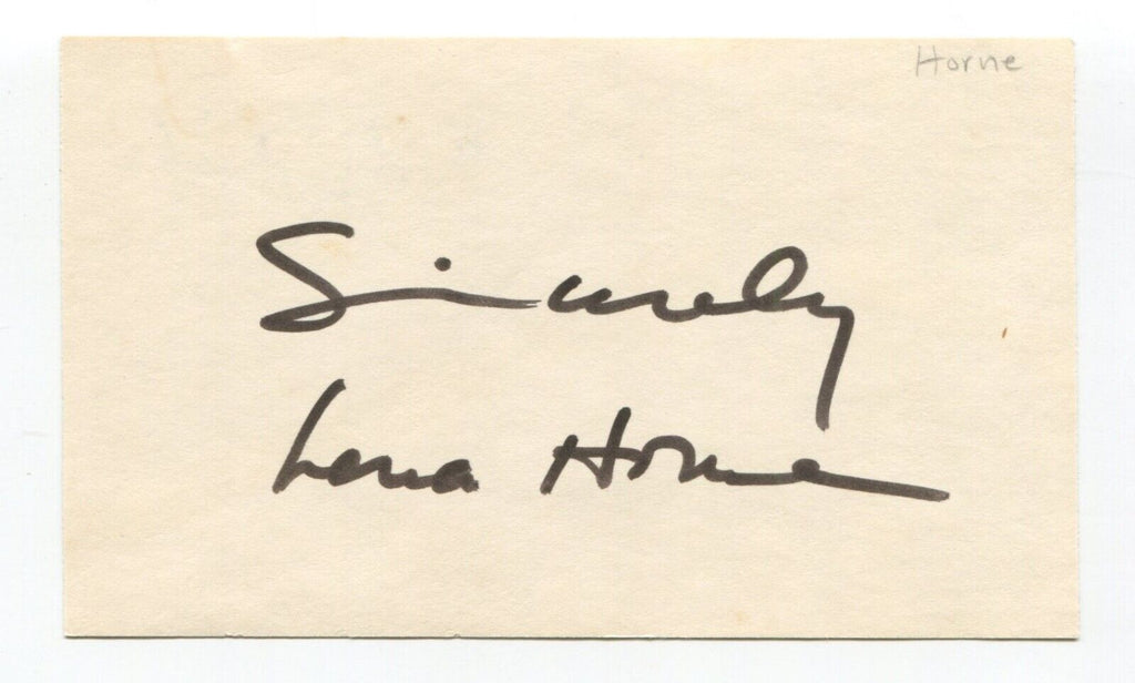 Up for sale is an autographed 3x5 index card, boldly signed by actress Lena Horne. Just a great looking autograph that will display nicely. Autograph was part of over 120 signed index cards mostly obtained in the 1980's and 1990's.