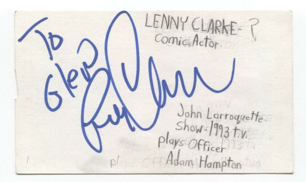 Up for sale is an autographed index card, boldly signed by comedian and actor Lenny Clarke. This autograph was part of an enormous collection of over 9000 in person collected signatures.