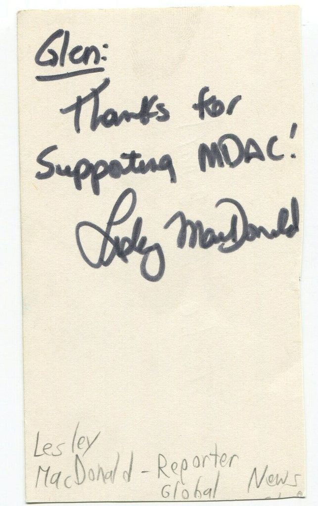 Lesley MacDonald Signed 3x5 Index Card Autographed Canadian Journalist Reporter