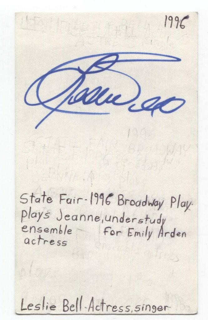 Up for sale is an autographed 3x5 index card, boldly signed by actress Leslie Bell.