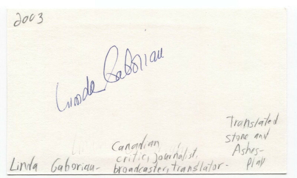 Up for sale is an autographed 3x5 index card, boldly signed by translator Linda Gaboriau. This autograph was part of an enormous collection of over 9000 in person collected signatures.