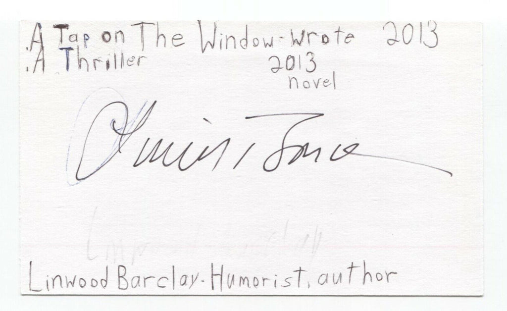 Up for sale is an autographed 3x5 index card, boldly signed by author Linwood Barclay. This autograph was part of an enormous collection of over 9000 in person collected signatures.