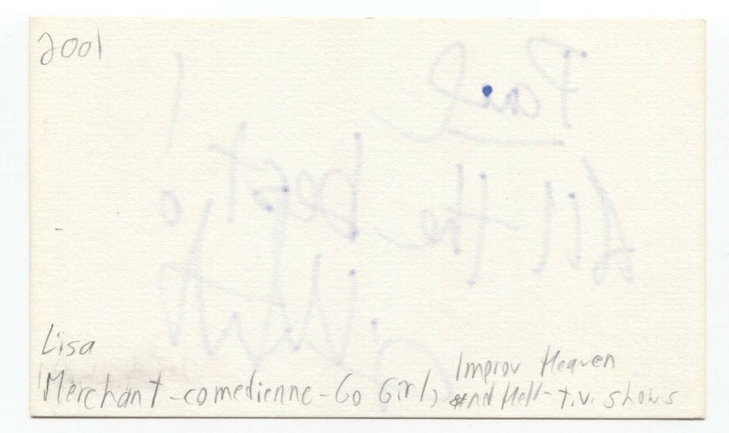 Up for sale is an autographed 3x5 index card, boldly signed by comedian Lisa Merchant. This autograph was part of an enormous collection of over 9000 in person collected signatures.