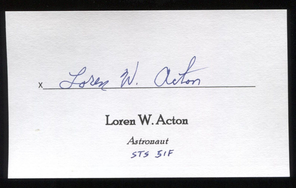 Up for sale is a signed 3x5 index card, autographed by the astronaut Loren W. Acton. Beautifully signed in blue ink pen, this will be a great example to matte and frame with a vintage photo. Signature was obtained by an autograph seeker whose collection I purchased in it's entirety.