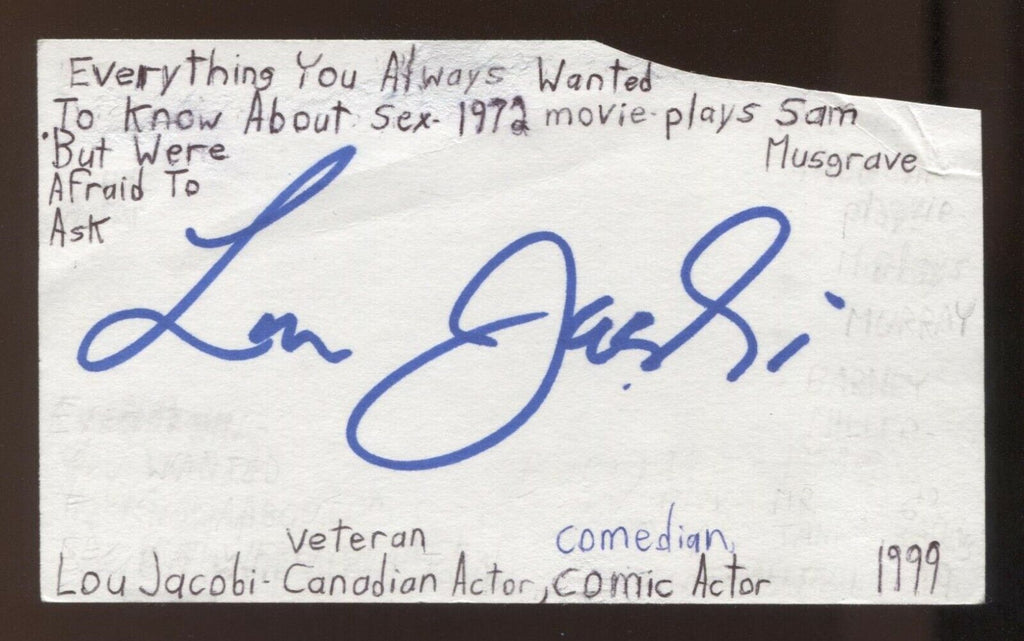 Up for sale is an autographed 3x5 index card, boldly signed by Lou Jacobi.  Autograph was part of an enormous collection of over 9000 in person collected signatures.