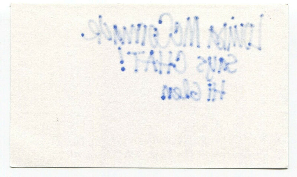 Up for sale is an autographed 3x5 index card, boldly signed by Canadian TV host and author Louisa McCormack. Autograph was part of an enormous collection of over 9000 in person collected signatures, all acquired by the great Glenn Marshall.