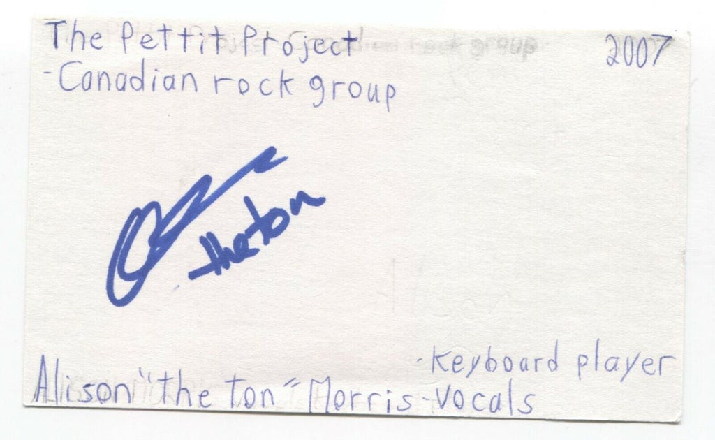 Up for sale is an autographed 3x5 index card, boldly signed by Alison "The Ton" Morris, of the band Love You To Death (formerly The Pettit Project).  This autograph was part of an enormous collection of over 9000 in person collected signatures.