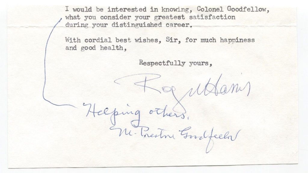 Up for sale is a signed note, boldly autographed by M. Preston Goodfellow. Autograph was part of the well known single owner, original "Roger Harris" collection of thousands of autographs, acquired over many decades of collecting.