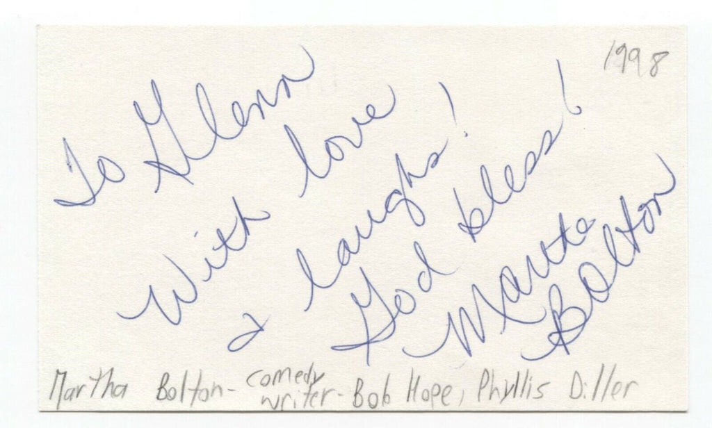 Up for sale is an autographed 3x5 index card, boldly signed by comedy writer Martha Bolton. This autograph was part of an enormous collection of over 9000 in person collected signatures.