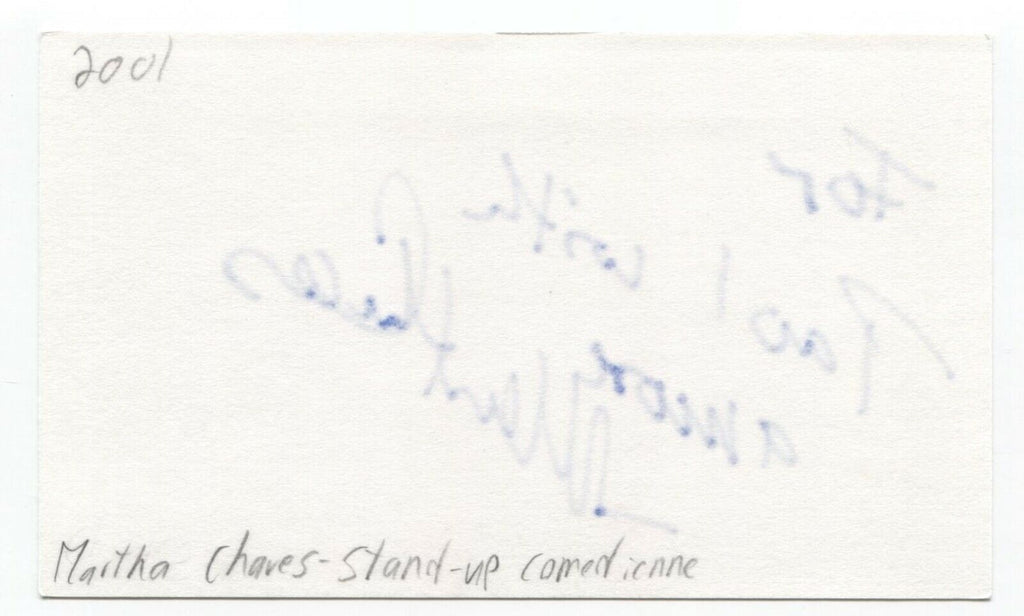 Up for sale is an autographed 3x5 index card, boldly signed comedian Martha Chaves.