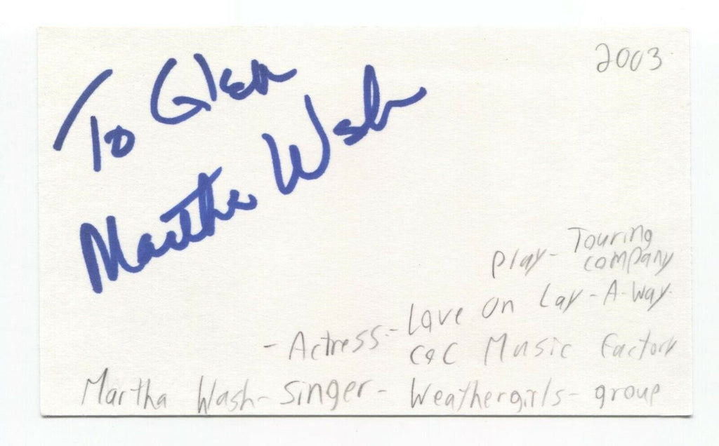 Up for sale is an autographed 3x5 index card, boldly signed by Martha Wash. Autograph was part of an enormous collection of over 9000 in person collected signatures.