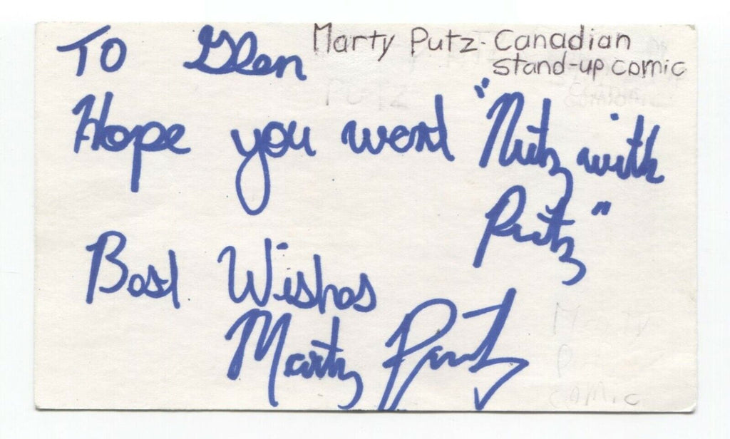 Up for sale is an autographed 3x5 index card, boldly signed by comedian Marty Putz.