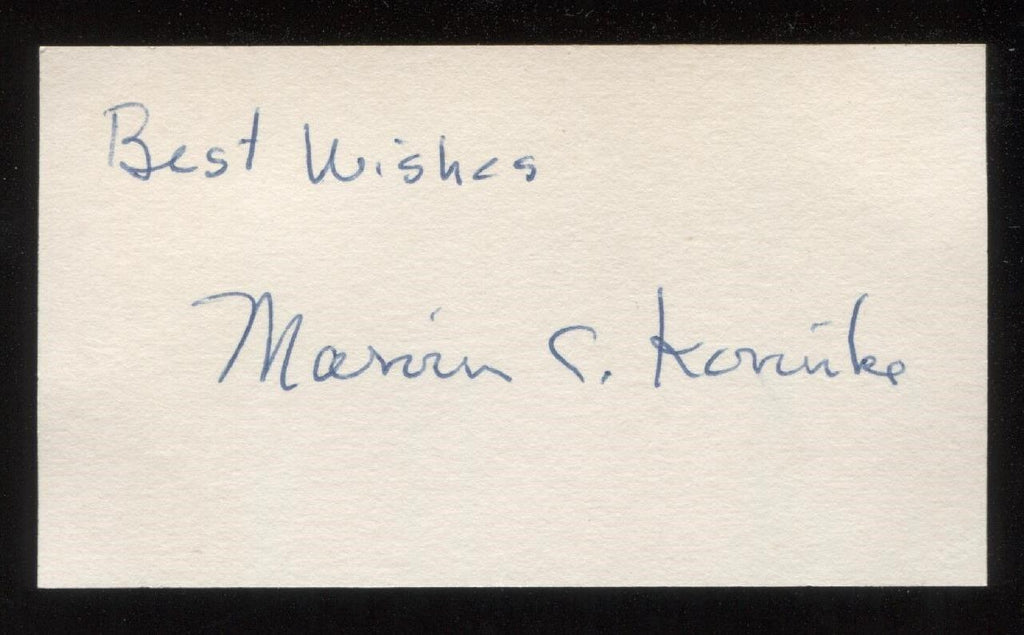 Buy it now or best offer on this signed card, autographed boldly by Marvin Korinke. Nice early career signature of the organ player. This is the first autograph of his that I have encountered in my many years of dealing in autographs. Card measures approximately 3.25 x 2 inches in size, and is the perfect example to matte and frame with a vintage photograph. Autograph was part of a vintage collection spanning 1931 - 1953, of which I purchased in it's entirety, and will be listing over the coming week.