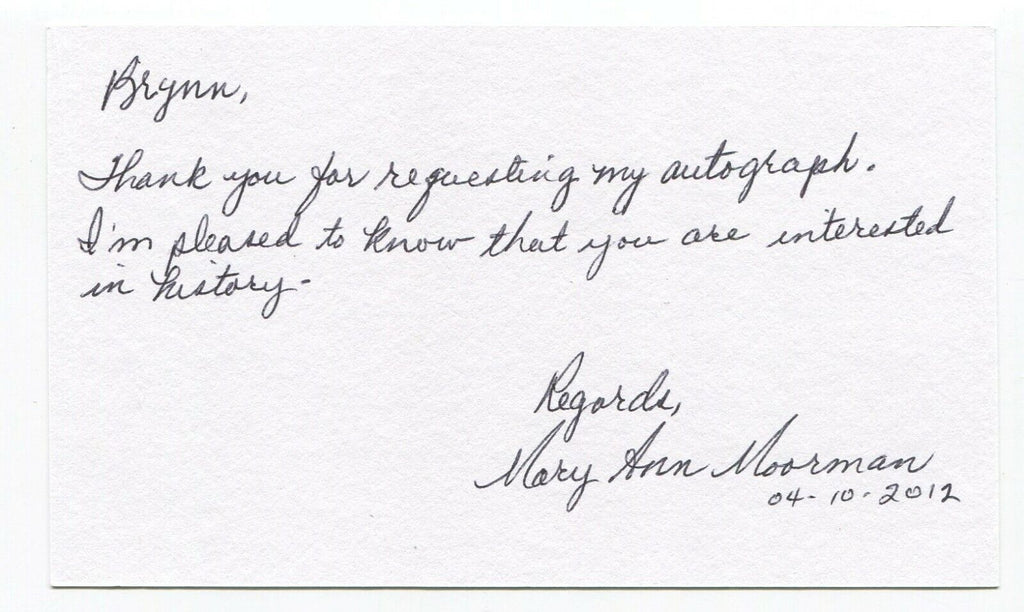 Mary Ann Moorman Signed 3x5 Index Card Autograph JFK Assassination Witness
