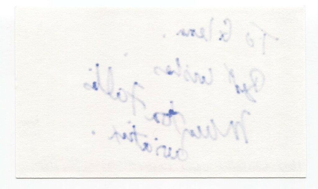 Up for sale is an autographed 3x5 index card, boldly signed by opera singer Mary Lou Fallis. Autograph was part of an enormous collection of over 9000 in person collected signatures.