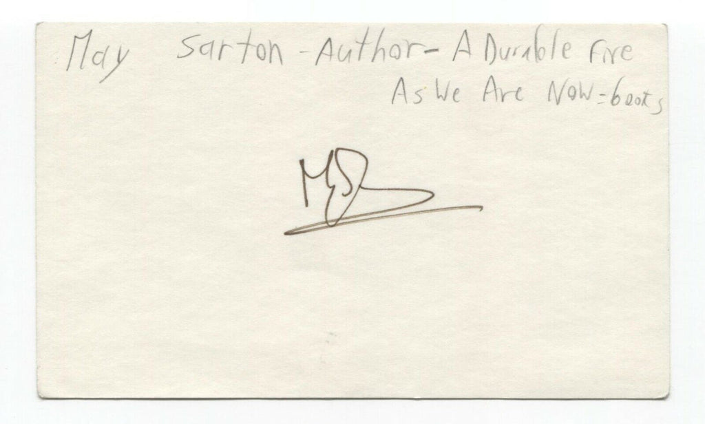 Up for sale is an autographed 3x5 index card, boldly signed by poet May Sarton. This autograph was part of an enormous collection of over 9000 in person collected signatures.
