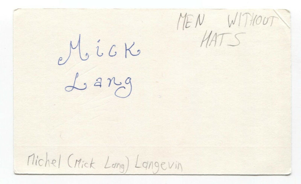 Up for sale is an autographed 3x5 index card, boldly signed by Michel Langevin, of the band Men Without Hats.  This autograph was part of an enormous collection of over 9000 in person collected signatures.