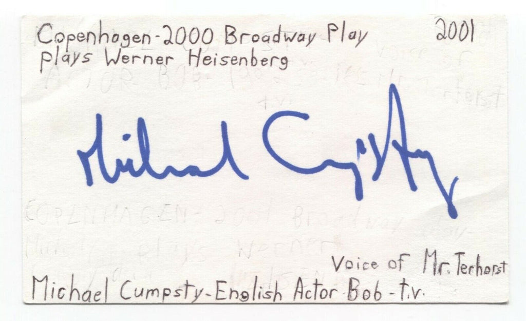 Up for sale is an autographed 3x5 index card, boldly signed by Michael Cumpsty. Autograph was part of an enormous collection of over 9000 in person collected signatures.