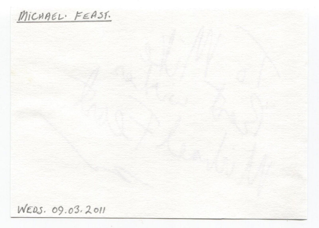 Originating from the "Michael Berry" autograph collection, this thick white paper page features a bold and clear purple pen autograph of Michael Feast. Page itself measures approximately 5.5 x 4 inches in size.