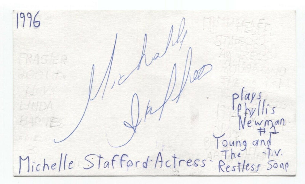 Up for sale is an autographed 3x5 index card, boldly signed by actress Michelle StaffordThis autograph was part of an enormous collection of over 9000 in person collected signatures.