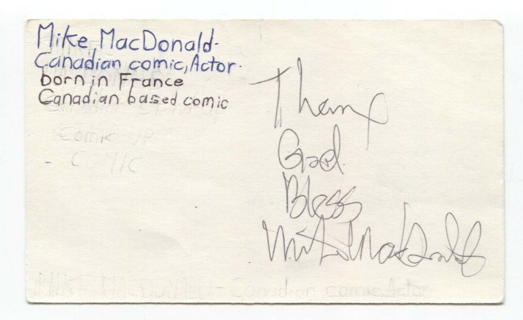 Up for sale is an autographed 3x5 index card, boldly signed by actor and comedian Mike MacDonald.  This autograph was part of an enormous collection of over 9000 in person collected signatures.
