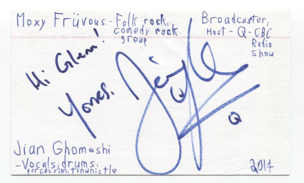 Up for sale is an autographed 3x5 index card, boldly signed by Jian Ghomeshi, of the band Moxy Fruvous.  This autograph was part of an enormous collection of over 9000 in person collected signatures.