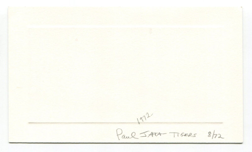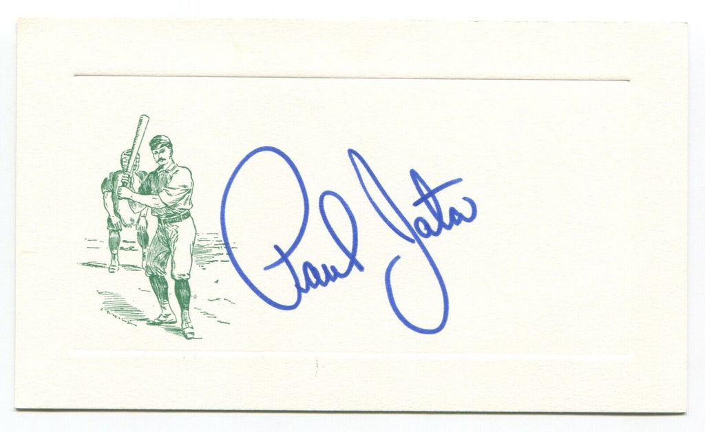 Up for sale is an autographed card approximately 3.5 x 5.5 inch card, boldly signed by baseball player Paul Jata. Just a great looking autograph that will display nicely.   Autograph was acquired by renowned autograph collector Roger Harris.