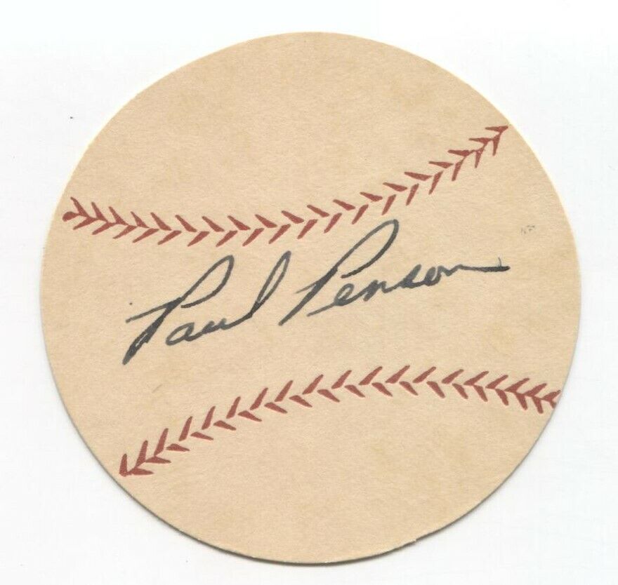 Up for sale is a signed thick paper stock baseball measuring approximately 2.5 inches in diameter, featuring an autograph of Paul Penson. This autograph was part of a large collection of over 700 vintage baseball autographs and memorabilia, all obtained between 1952 and 1954 by the same original owner.