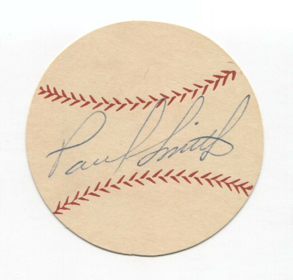 Up for sale is a signed thick paper stock baseball measuring approximately 2.5 inches in diameter, featuring an autograph of Paul Smith. The third image (not included with the item) shows the original mailing envelope the autograph was received in, postmarked from 1953. This autograph was part of a large collection of over 700 vintage baseball autographs and memorabilia, all obtained between 1952 and 1954 by the same original owner.