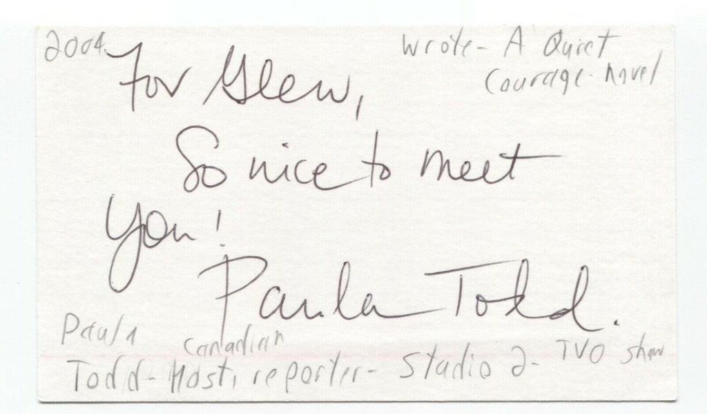 Up for sale is an autographed 3x5 index card, boldly signed by journalist Paula Todd.