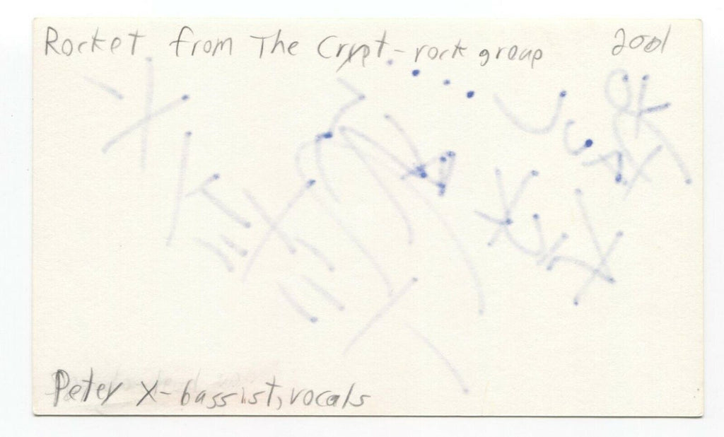 Up for sale is an autographed 3x5 index card, boldly signed by Petey X, of Rocket from the Crypt. Autograph was part of an enormous collection of over 9000 in person collected signatures.