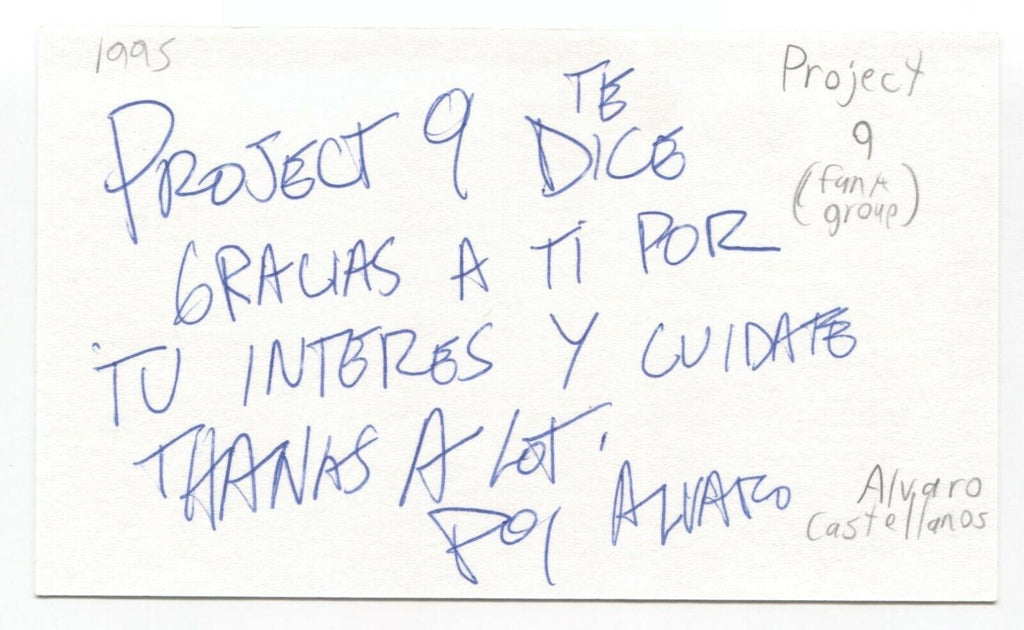 Up for sale is an autographed 3x5 index card, boldly signed by Alvaro Castellanos, of the band Project 9.  This autograph was part of an enormous collection of over 9000 in person collected signatures.