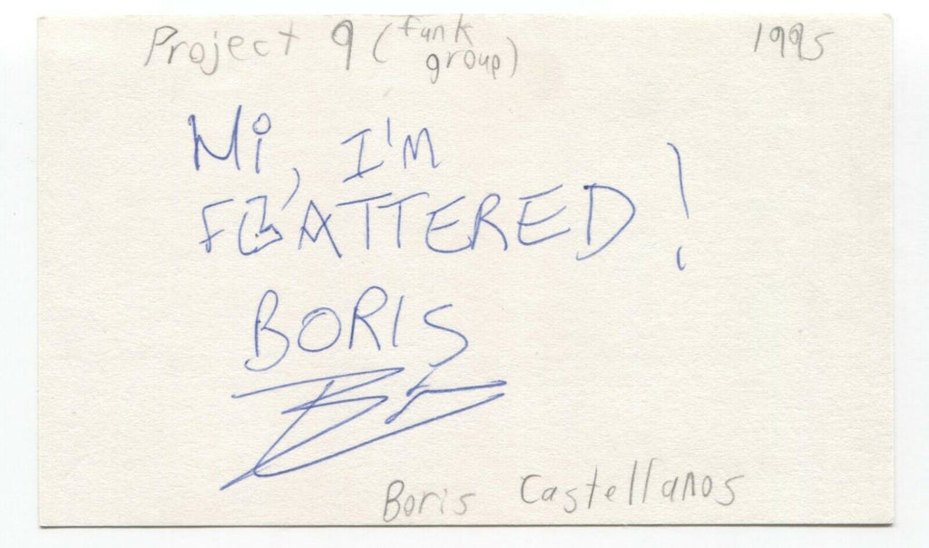 Up for sale is an autographed 3x5 index card, boldly signed by Boris Castellanos, of the band Project 9.  This autograph was part of an enormous collection of over 9000 in person collected signatures.