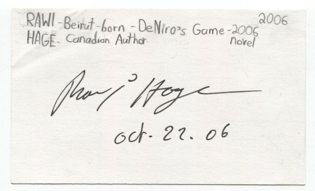 Rawi Hage Signed 3x5 Index Card Autographed Signature Author Writer Photographer