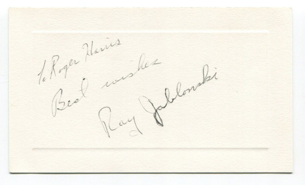 Up for sale is an autographed card approximately 3.5 x 5.5 inch card, boldly signed by baseball player Ray Jablonski. Just a great looking autograph that will display nicely. Autograph was acquired by renowned autograph collector Roger Harris.