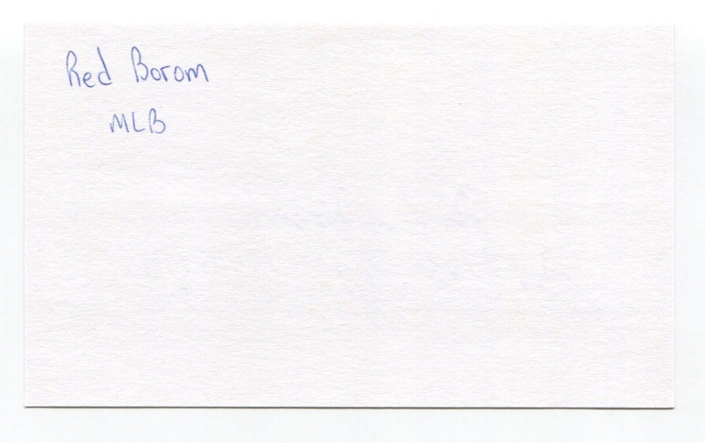 Up for sale is an autographed 3x5 index card, boldly signed by baseball player Red Borom. Just a great looking autograph that will display nicely. Autograph was part of a huge "MP" Collection, consisting of over 3,000 signed index cards that I was fortunate to purchase in it's entirety.