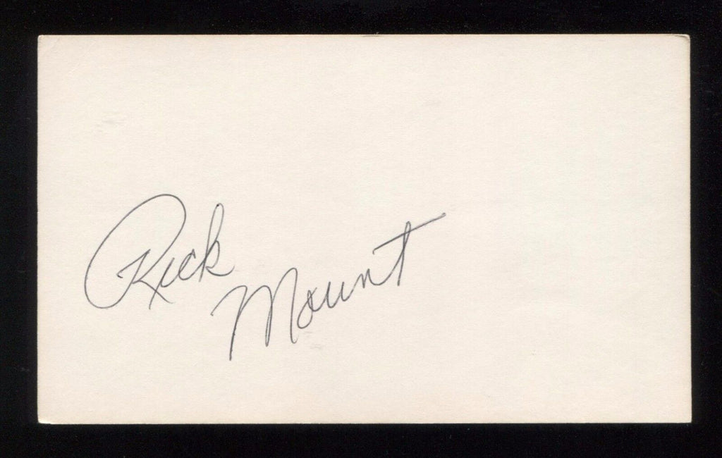 Up for sale is a 3x5 index card signed by Rick Mount.   Boldly signed in black ink pen on the index card, this will be a great example to matte and frame with a vintage photo.  Autograph was obtained circa the 1970's by an autograph collector whose collection I purchased in it's entirety.