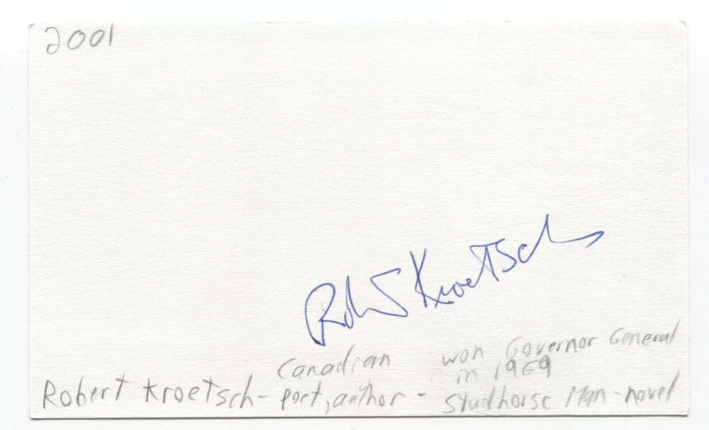 Up for sale is an autographed 3x5 index card, boldly signed by author Robert Kroetsch. This autograph was part of an enormous collection of over 9000 in person collected signatures.