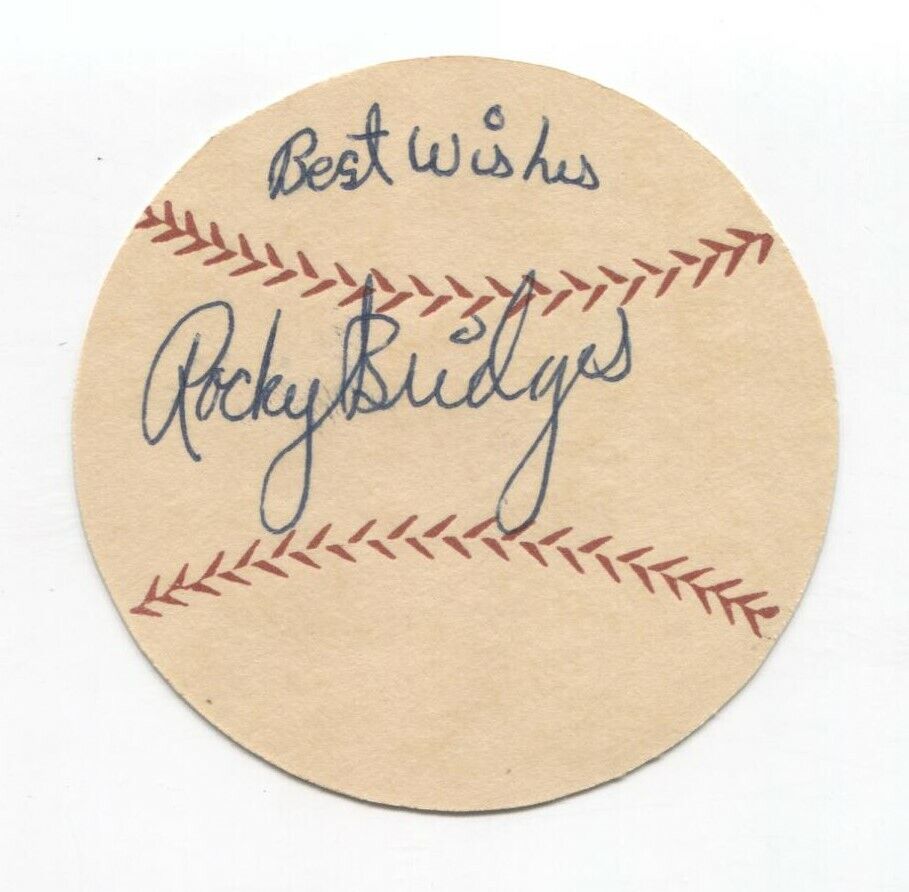 Up for sale is a signed thick paper stock baseball measuring approximately 2.5 inches in diameter, featuring an autograph of Rocky Bridges. The third image (not included with the item) shows the original mailing envelope the autograph was received in, postmarked from 1953. This autograph was part of a large collection of over 700 vintage baseball autographs and memorabilia, all obtained between 1952 and 1954 by the same original owner.