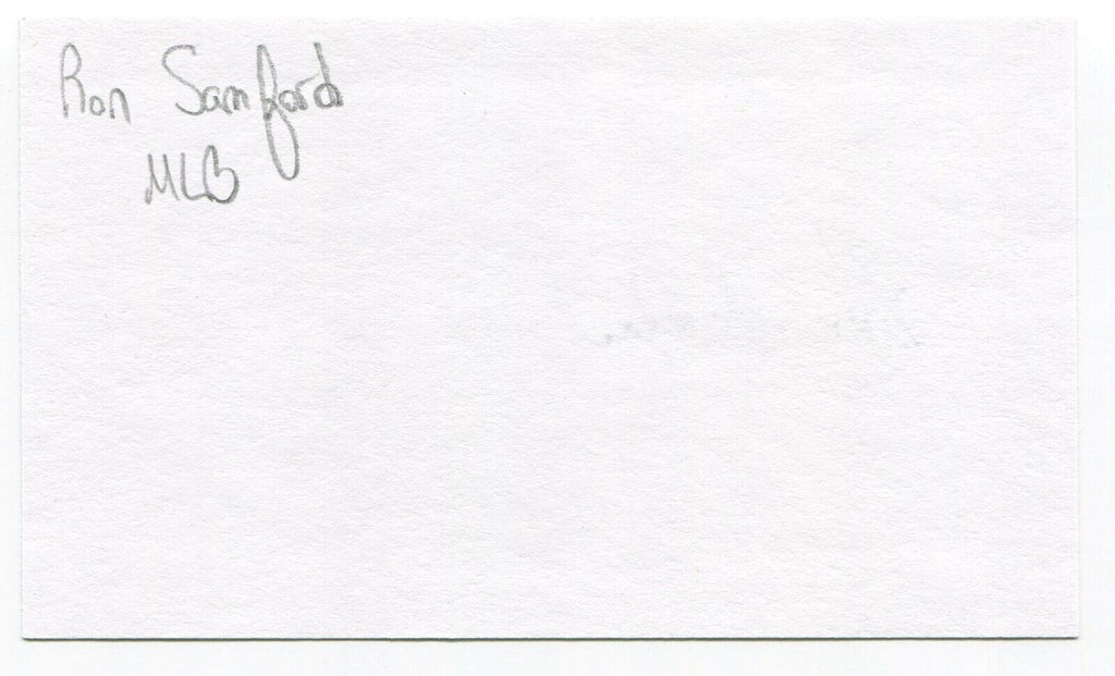 Up for sale is an autographed 3x5 index card, boldly signed by baseball player Ron Samford. Just a great looking autograph that will display nicely. Autograph was part of a huge "MP" Collection, consisting of over 3,000 signed index cards that I was fortunate to purchase in it's entirety.