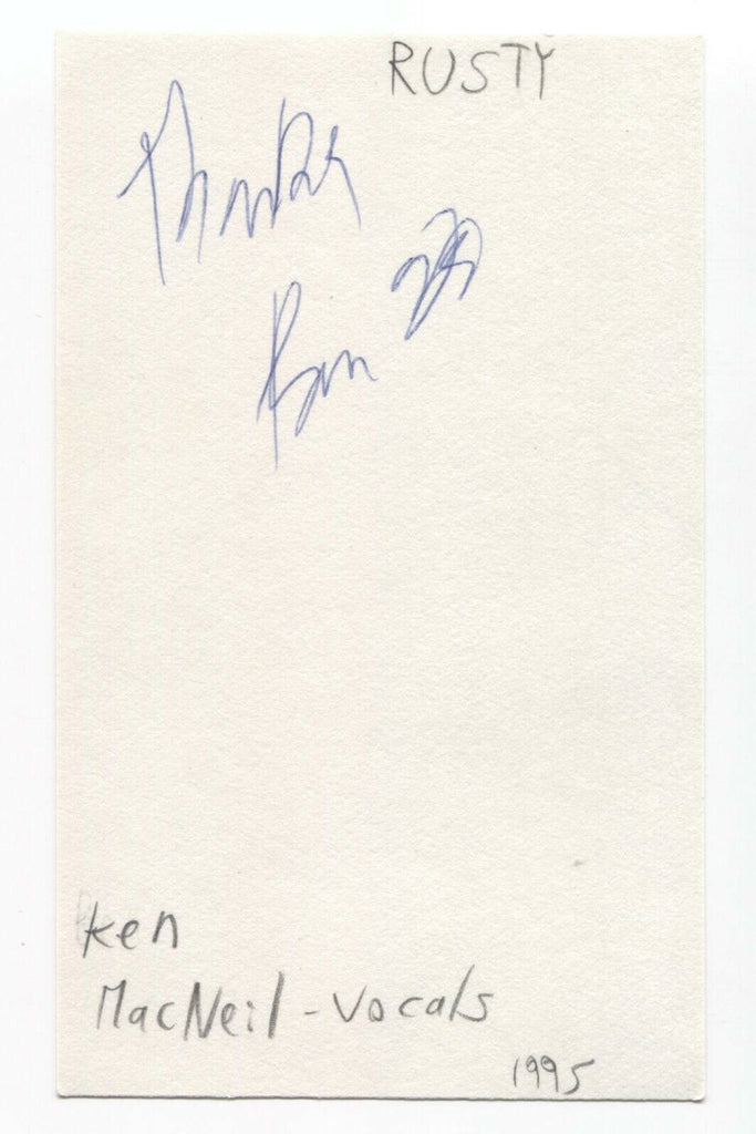 Up for sale is an autographed 3x5 index card, boldly signed by Ken MacNeil, of the band Rusty.  This autograph was part of an enormous collection of over 9000 in person collected signatures.