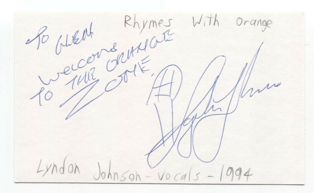 Up for sale is an autographed 3x5 index card, boldly signed by Lyndon Johnson, of the band Rymes with Orange. Autograph was part of an enormous collection of over 9000 in person collected signatures.