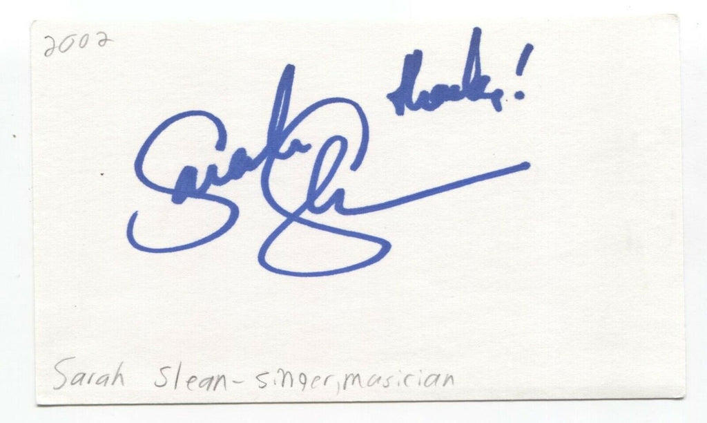 Up for sale is an autographed 3x5 index card, boldly signed by singer Sarah Slean. This autograph was part of an enormous collection of over 9000 in person collected signatures.
