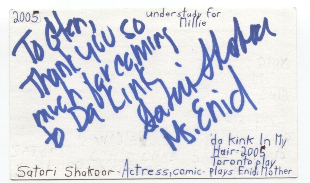 Up for sale is an autographed 3x5 index card, boldly signed by actress Satori Shakoor.