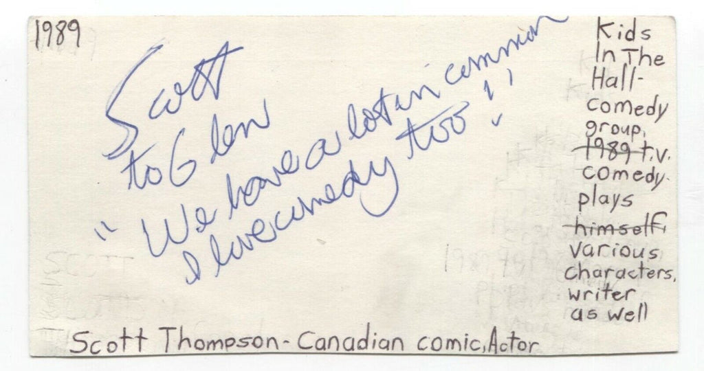 Up for sale is an autographed 3x5 index card, boldly signed by comedian Scott Thompson. This autograph was part of an enormous collection of over 9000 in person collected signatures.