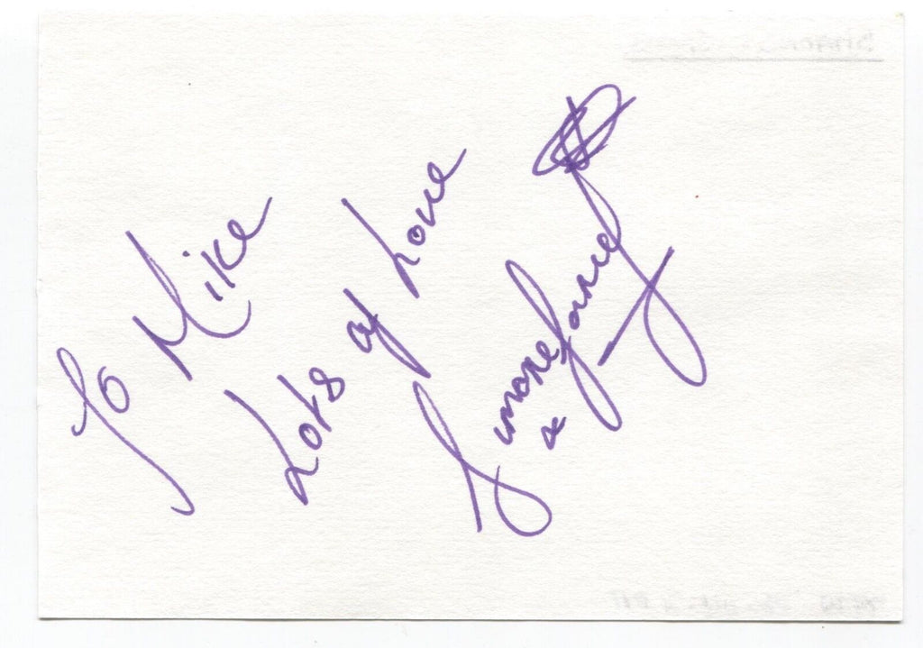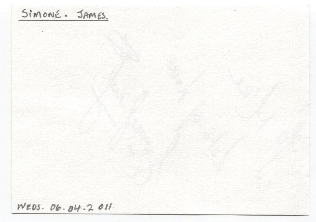 Originating from the "Michael Berry" autograph collection, this thick white paper page features a bold and clear purple pen autograph of Simone James. Page itself measures approximately 5.5 x 4 inches in size.