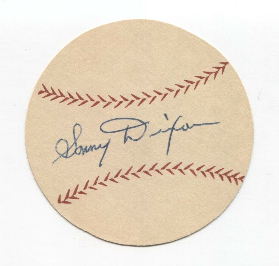 Up for sale is a signed thick paper stock baseball measuring approximately 2.5 inches in diameter, featuring an autograph of Sonny Dixon. The third scan (not included with the item) shows the original mailing envelope the signature was received in, postmarked from 1953. This autograph was part of a large collection of over 700 vintage baseball autographs and memorabilia, all obtained between 1952 and 1954 by the same original owner.