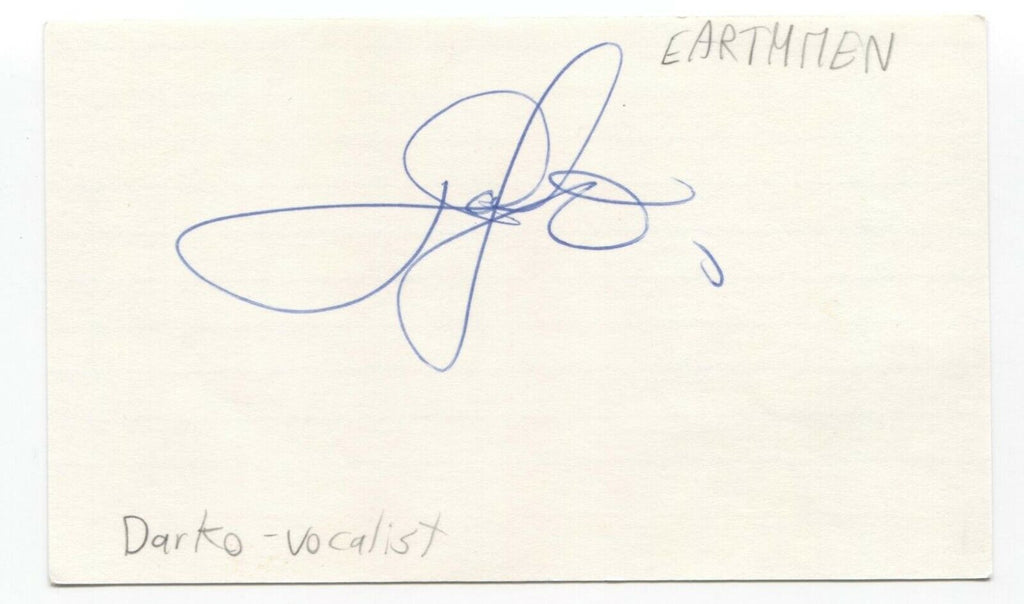 Up for sale is an autographed 3x5 index card, boldly signed by Darko, of the band The Earthmen. This autograph was part of an enormous collection of over 9000 in person collected signatures.